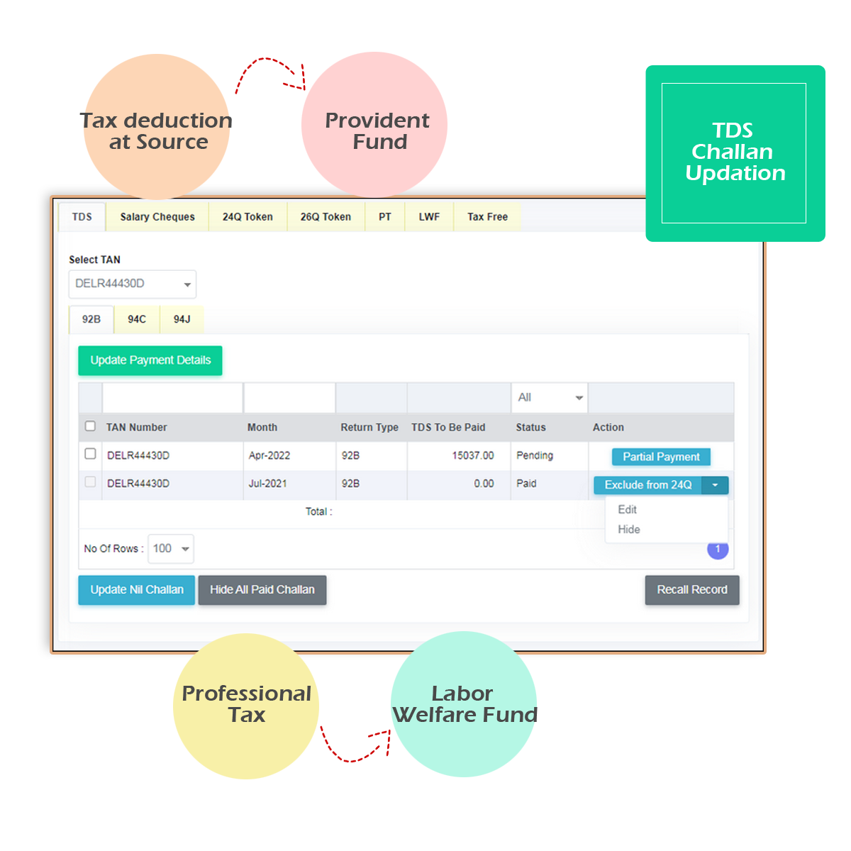 • Labor Welfare Fund (LWF) calculations based on the state laws
